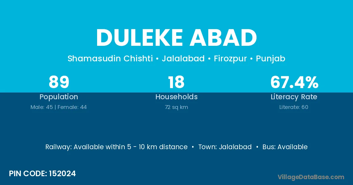 Duleke Abad village has a total population of 89 people, of which 45 are males and 44 are females.