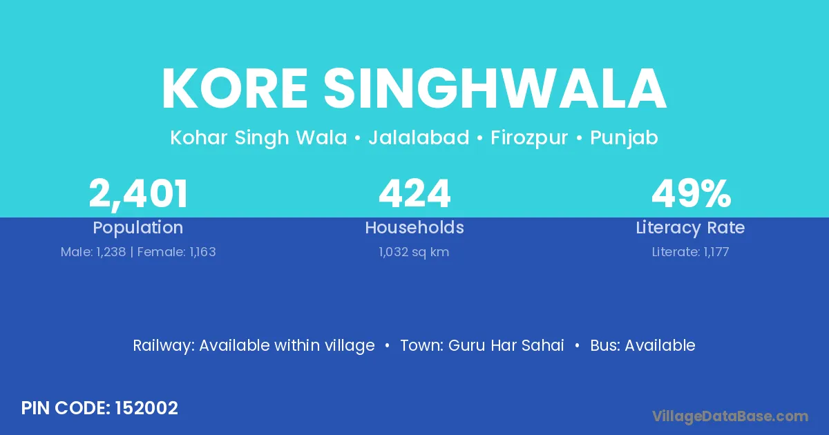 Kore Singhwala village has a total population of 2,401 people, of which 1,238 are males and 1,163 are females.