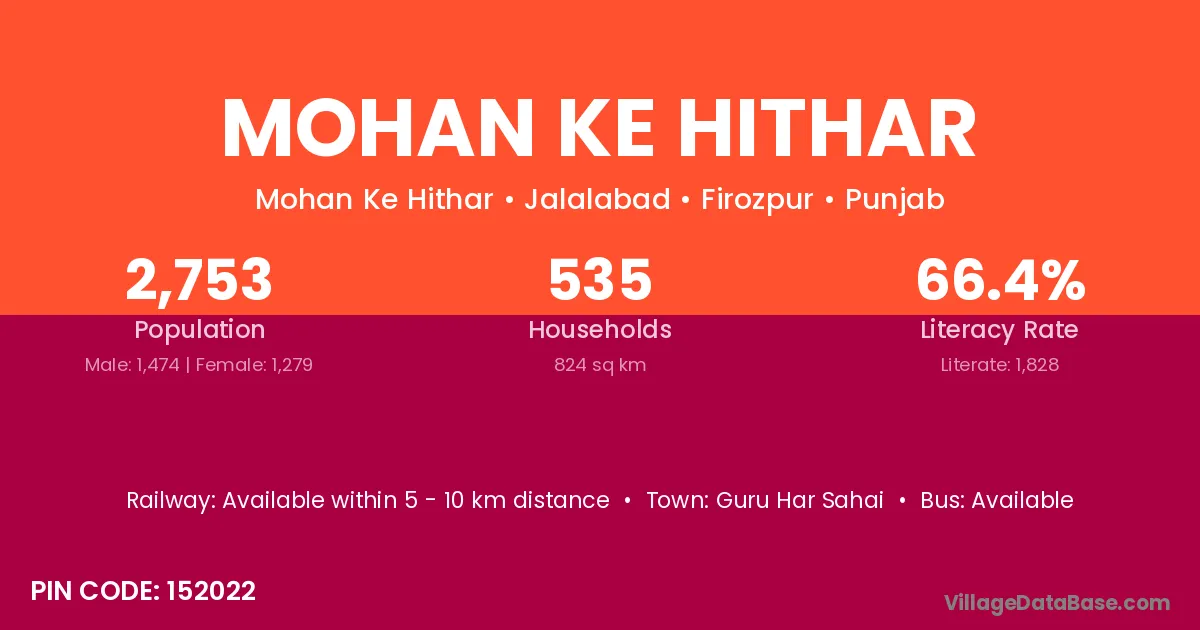 Mohan Ke Hithar village has a total population of 2,753 people, of which 1,474 are males and 1,279 are females.