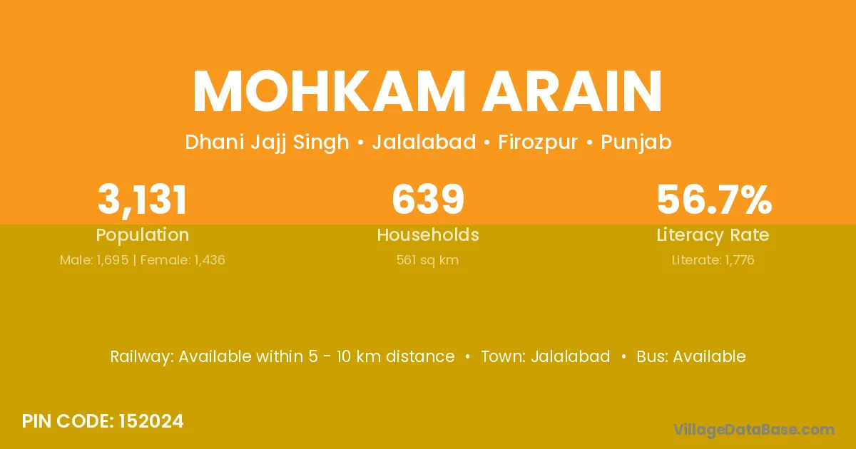 Mohkam Arain village has a total population of 3,131 people, of which 1,695 are males and 1,436 are females.