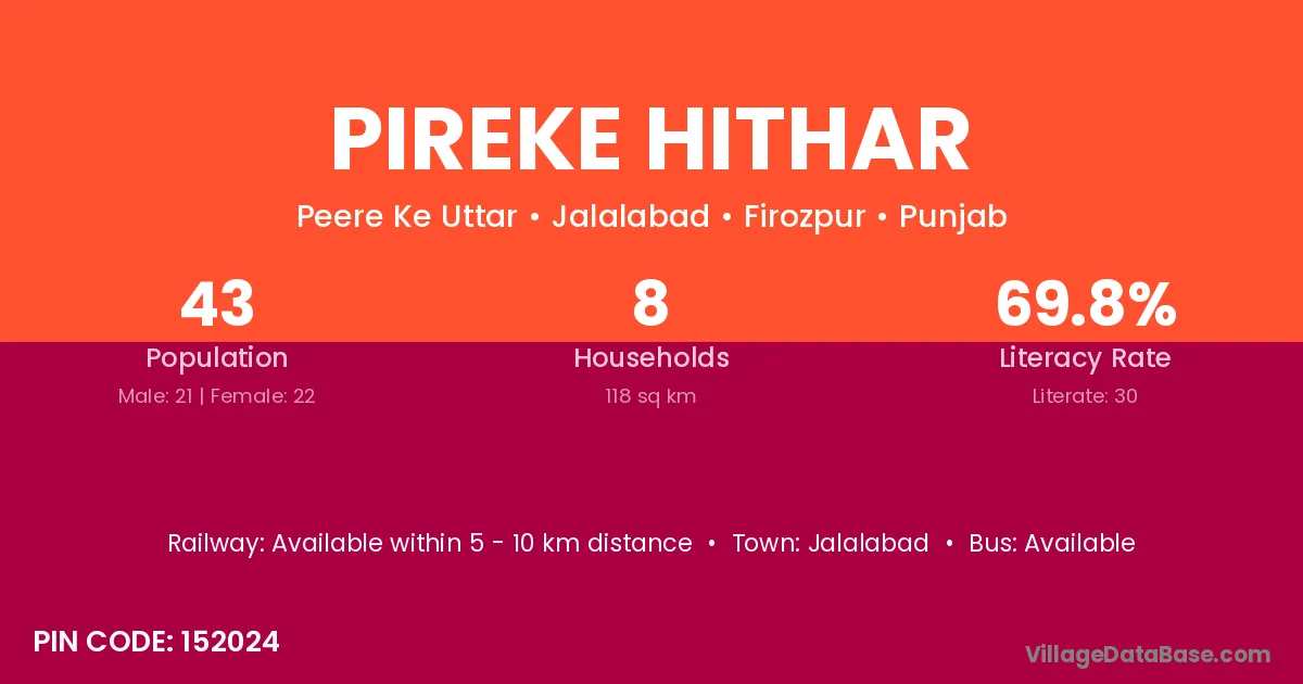 Pireke Hithar village has a total population of 43 people, of which 21 are males and 22 are females.