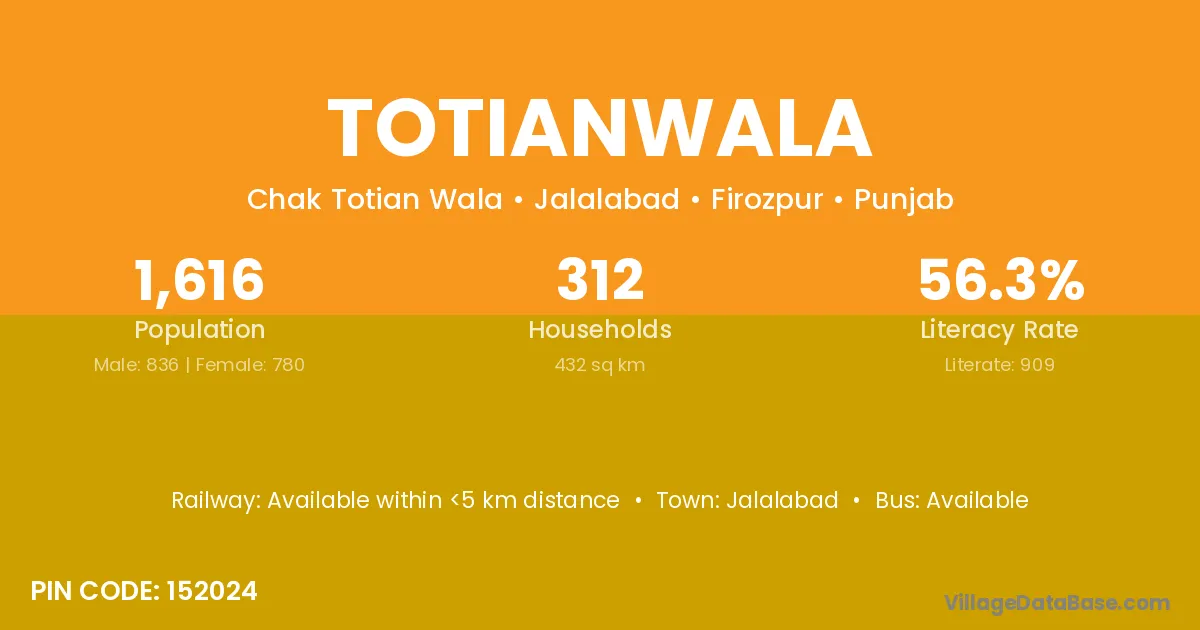 Jalalabad is the nearest town to Totianwala village for major economic activities