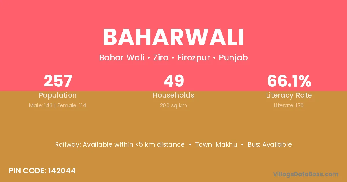 Baharwali village has a total population of 257 people, of which 143 are males and 114 are females.