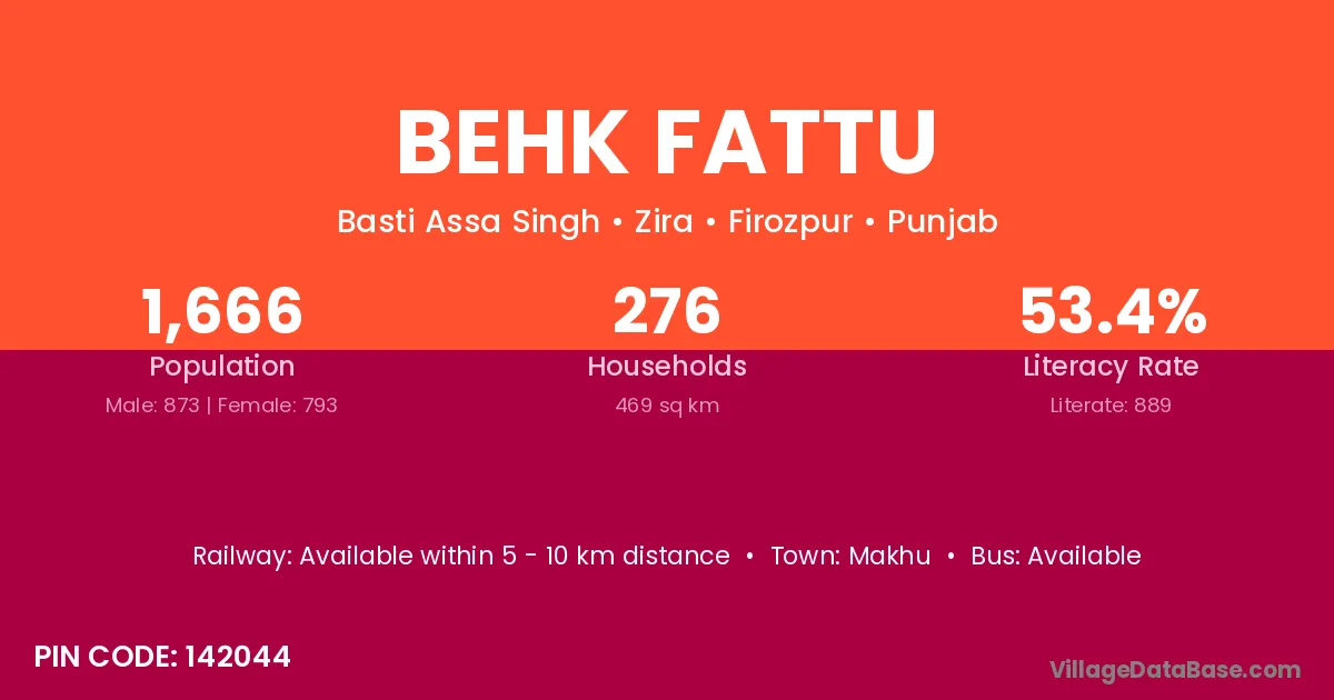 Behk Fattu village has a total population of 1,666 people, of which 873 are males and 793 are females.