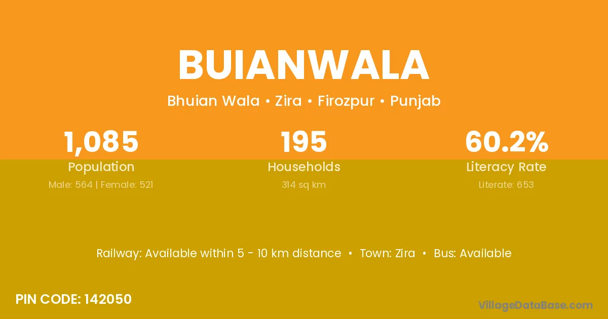 Buianwala village has a total population of 1,085 people, of which 564 are males and 521 are females.