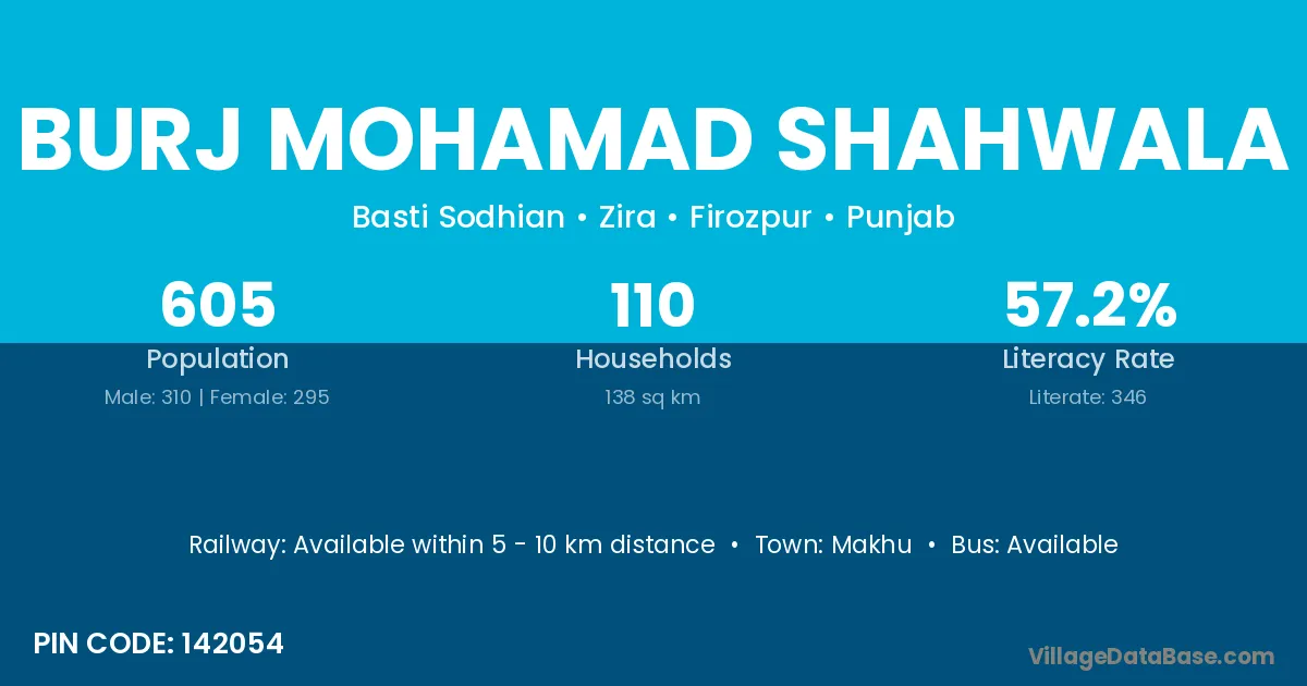 Burj Mohamad Shahwala village has a total population of 605 people, of which 310 are males and 295 are females.