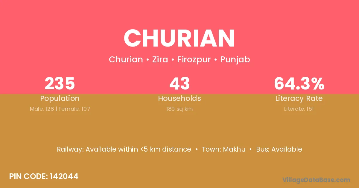 Churian village is located in the Zira Tehsil of the Firozpur district in Punjab .