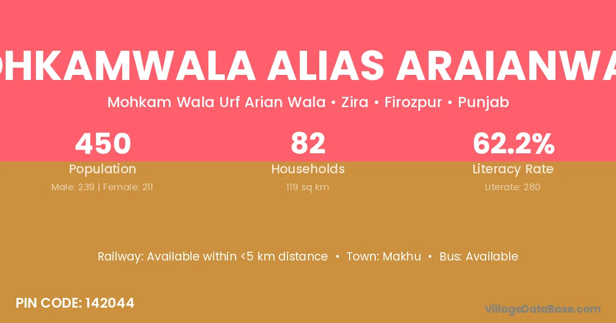 Mohkamwala Alias Araianwala village has a total population of 450 people, of which 239 are males and 211 are females.
