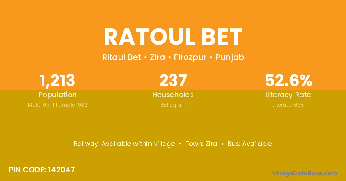 Ratoul Bet village has a total population of 1,213 people, of which 631 are males and 582 are females.