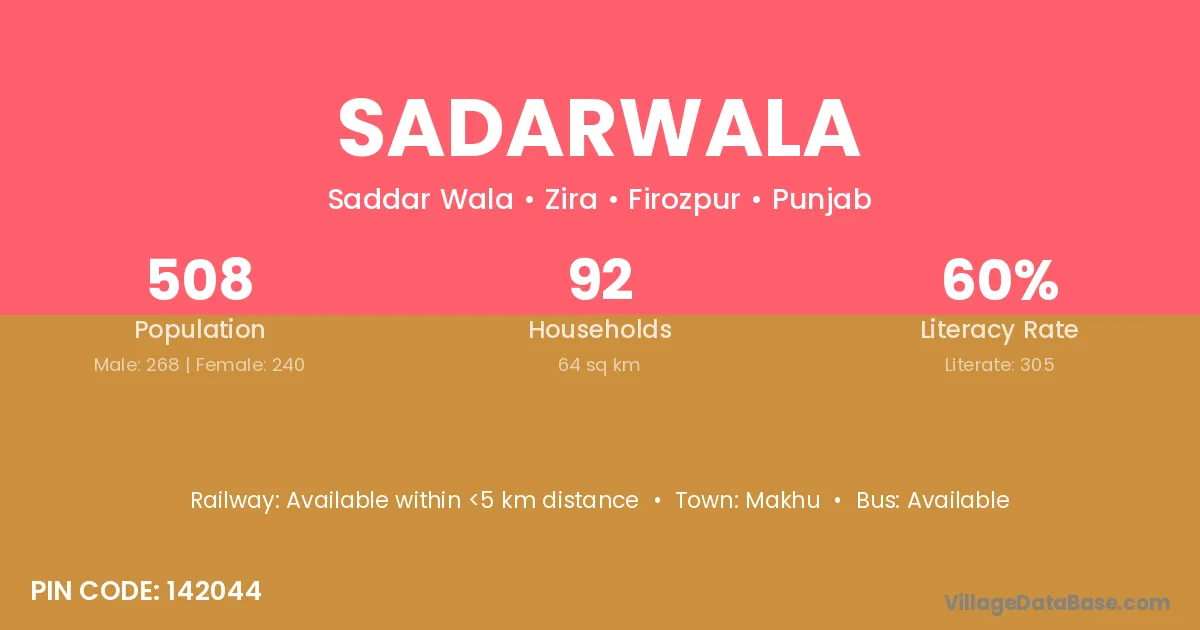 Sadarwala village has a total population of 508 people, of which 268 are males and 240 are females.