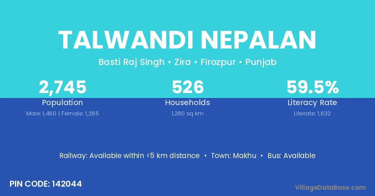 The literacy rate of Talwandi Nepalan village is 59.45%. Male literacy stands at 65.07% and female literacy at 53.07%.
