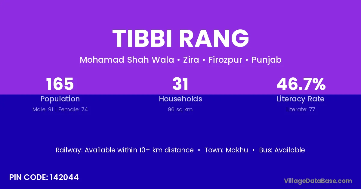 Tibbi Rang village has a total population of 165 people, of which 91 are males and 74 are females.