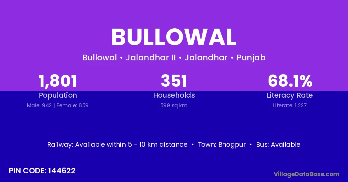 The literacy rate of Bullowal village is 64.34%. Male literacy stands at 66.67% and female literacy at 61.63%.