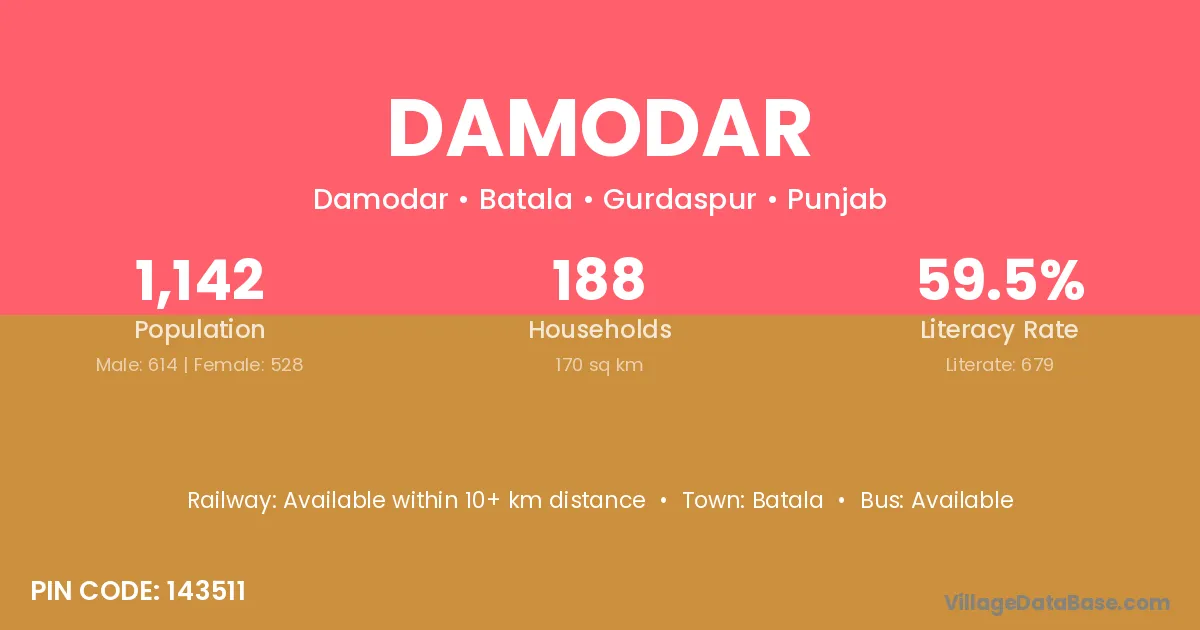 According to Census 2011 information, the village code of Damodar village is 143511.