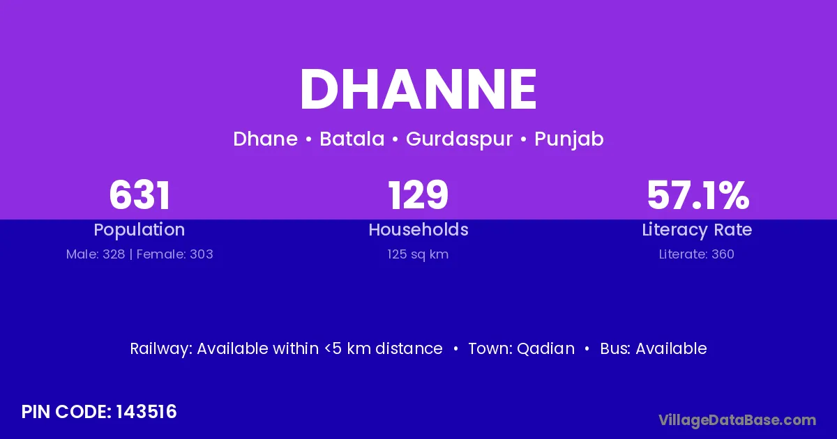 Dhanne village has a total population of 631 people, of which 328 are males and 303 are females.