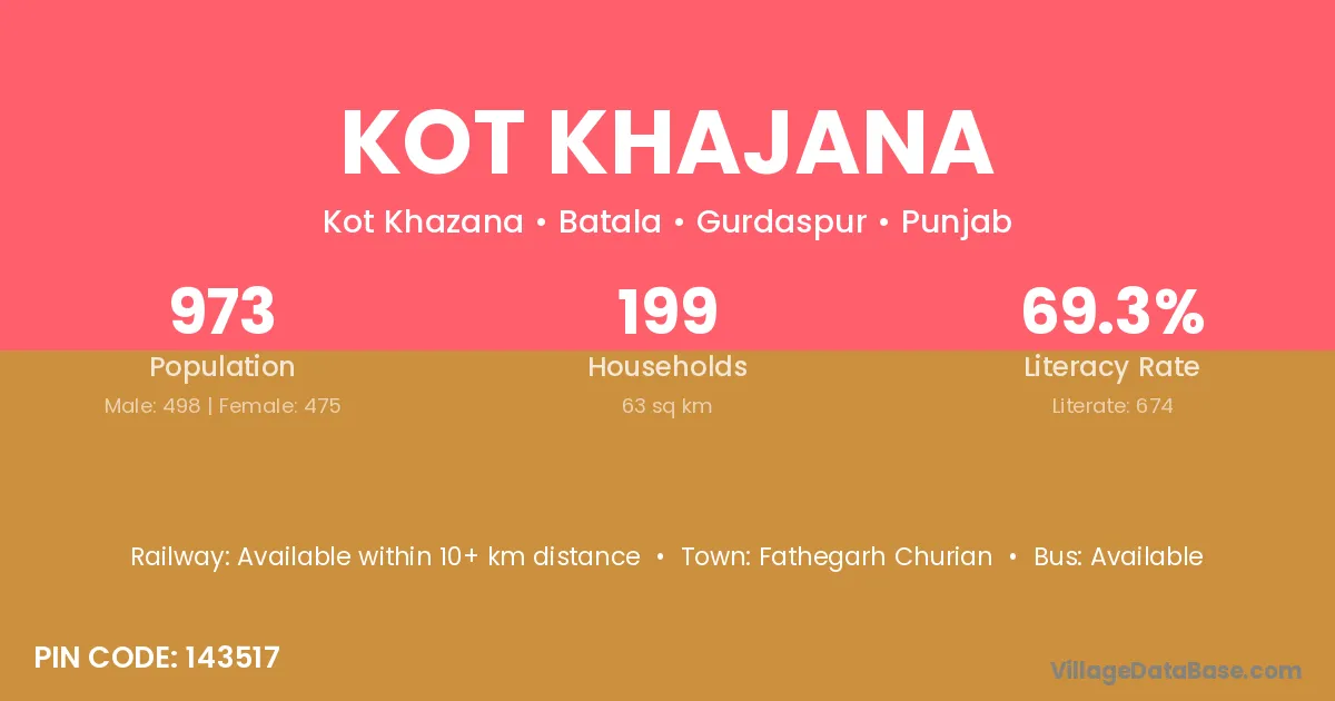 Kot Khajana village has a total population of 973 people, of which 498 are males and 475 are females.