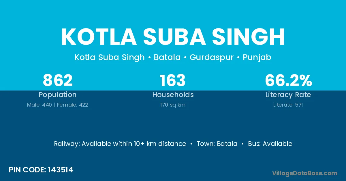 Kotla Suba Singh village has a total population of 862 people, of which 440 are males and 422 are females.