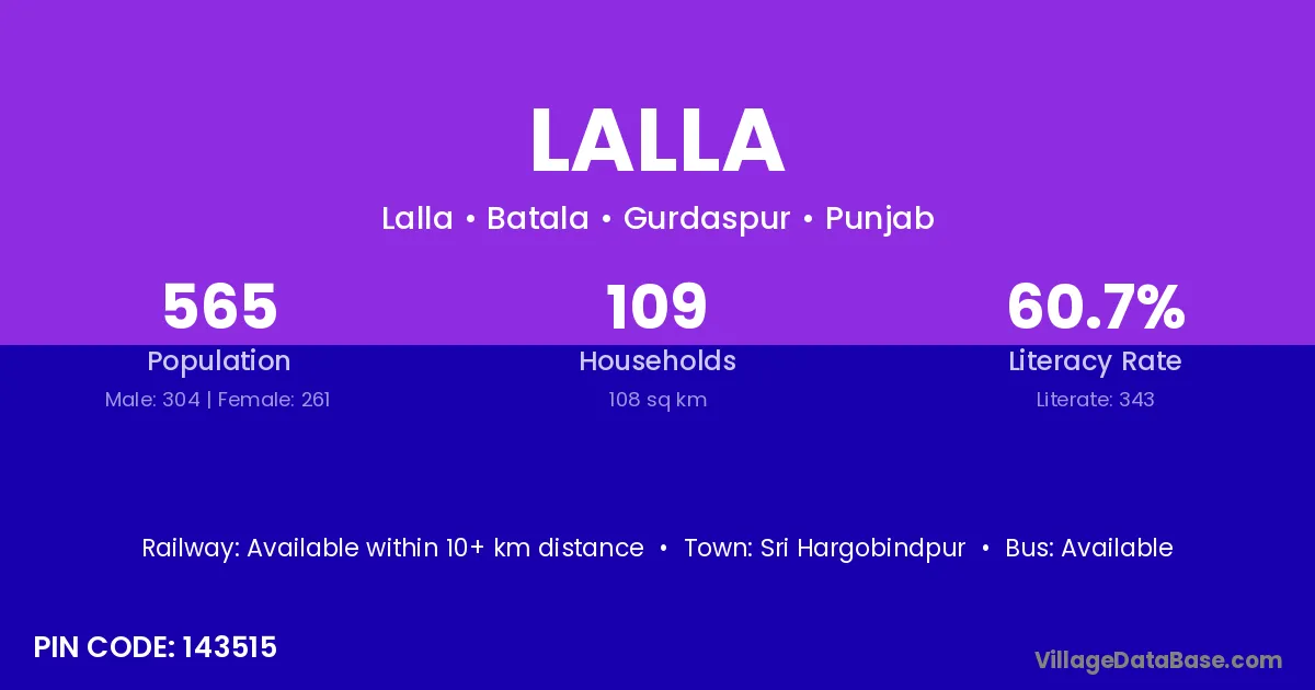 According to Census 2011 information, the village code of Lalla village is 143515.