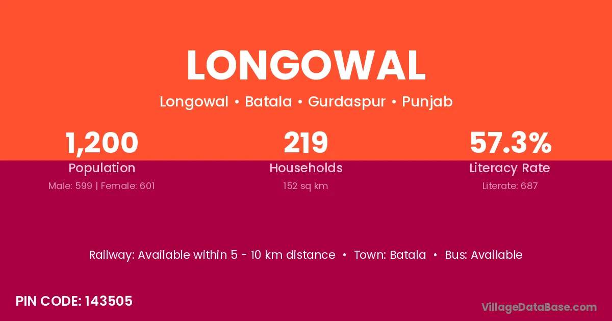 Longowal village has a total population of 1,200 people, of which 599 are males and 601 are females.