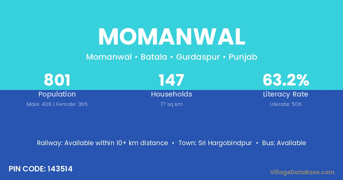 Momanwal village has a total population of 801 people, of which 406 are males and 395 are females.