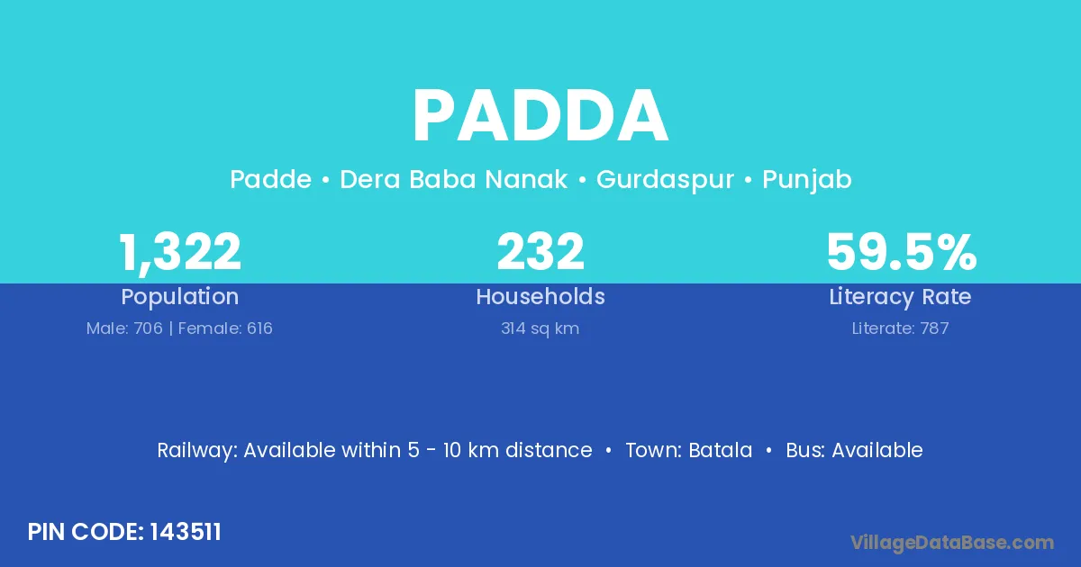 According to Census 2011 information, the village code of Padda village is 143514.