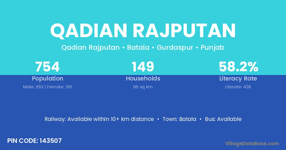 Qadian Rajputan village has a total population of 754 people, of which 393 are males and 361 are females.