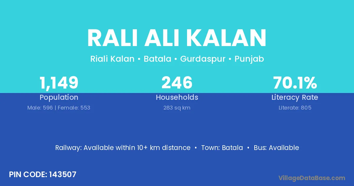 Rali Ali Kalan village has a total population of 1,149 people, of which 596 are males and 553 are females.