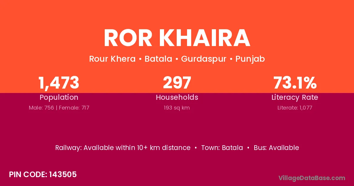 Ror Khaira village has a total population of 1,473 people, of which 756 are males and 717 are females.