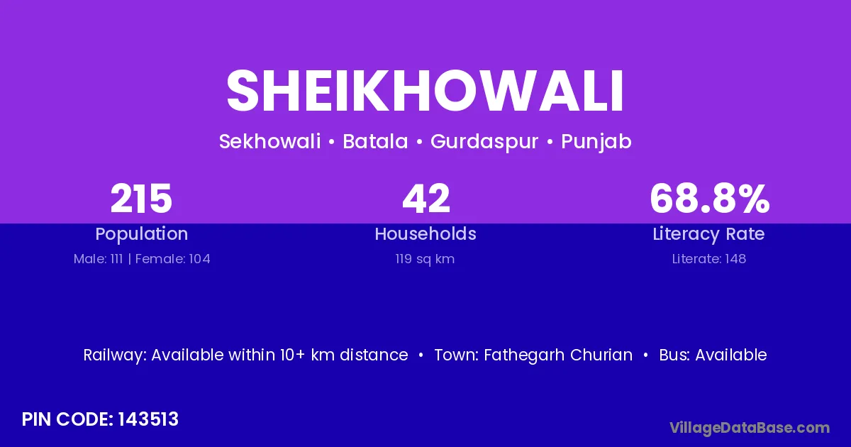 Sheikhowali village has a total population of 215 people, of which 111 are males and 104 are females.