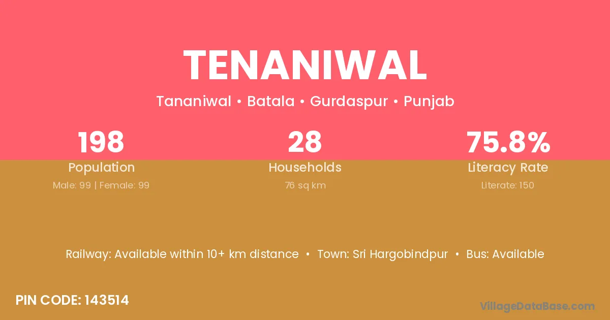 Tenaniwal village has a total population of 198 people, of which 99 are males and 99 are females.