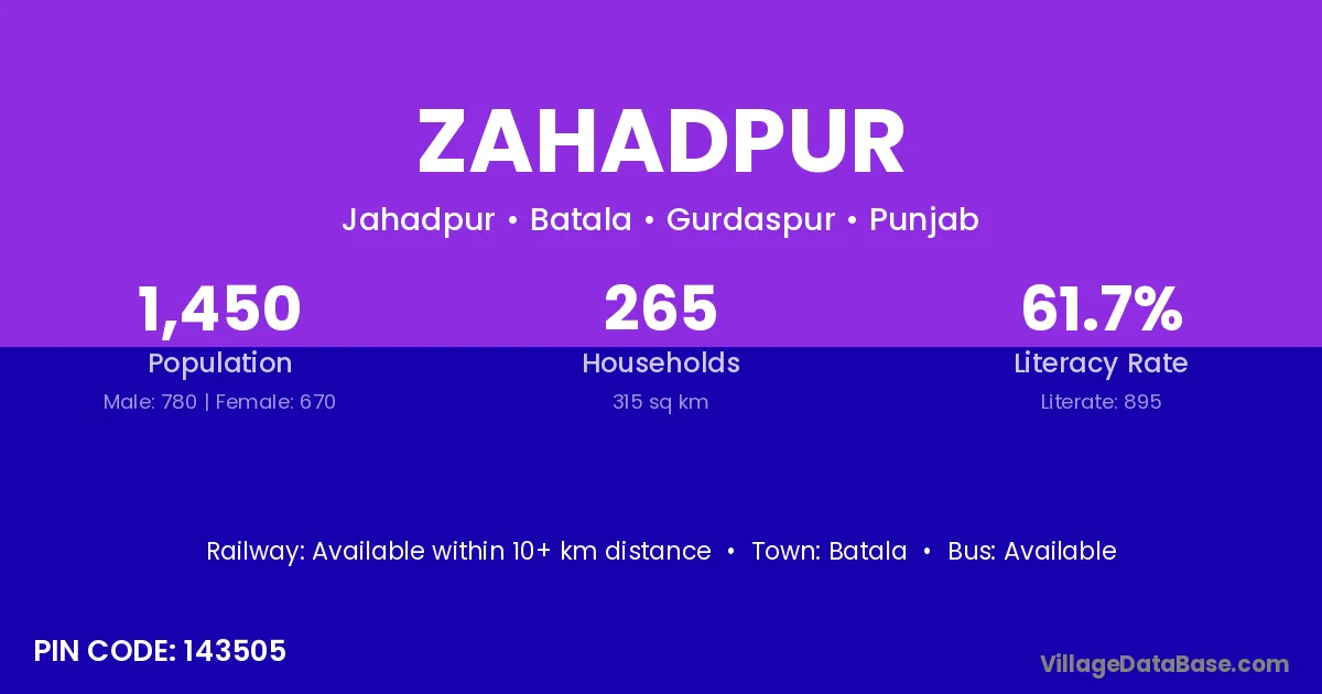 Zahadpur village has a total population of 1,450 people, of which 780 are males and 670 are females.