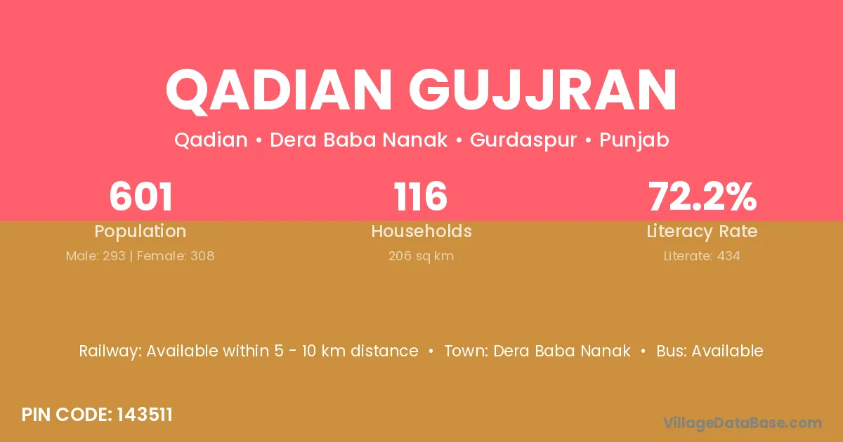 According to Census 2011 information, the village code of Qadian Gujjran village is 143511.