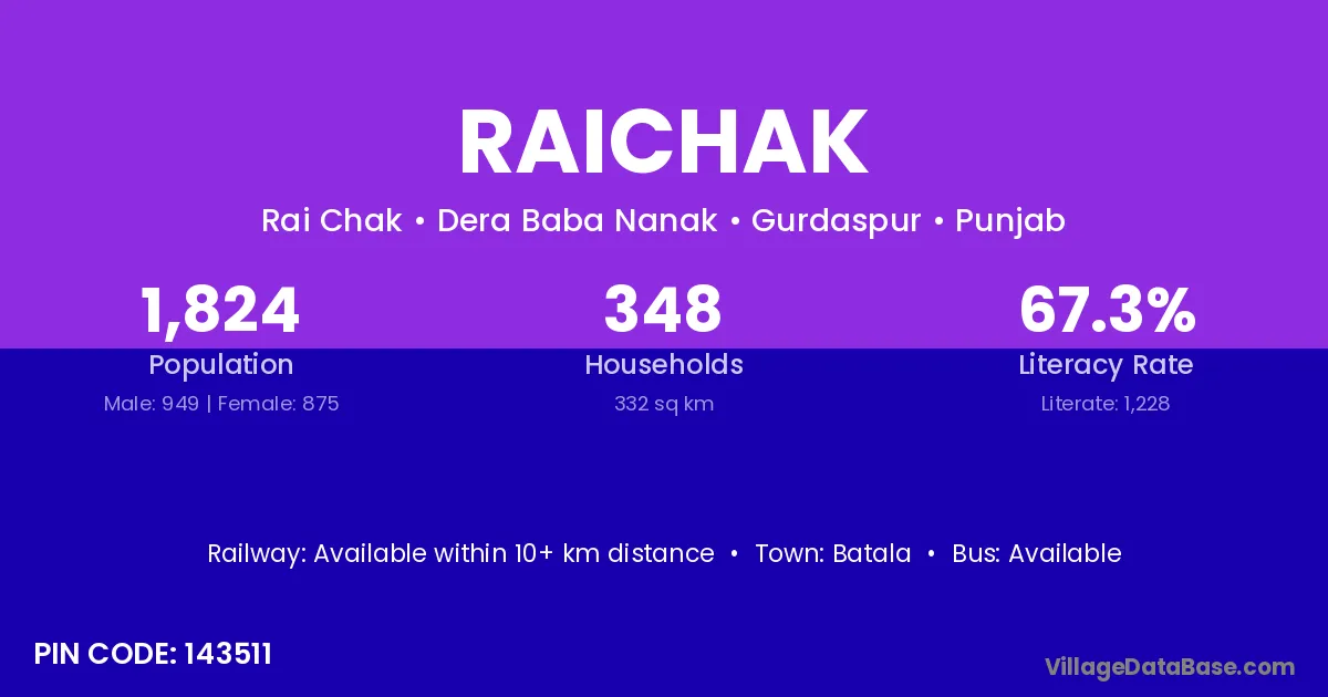According to Census 2011 information, the village code of Raichak village is 143511.