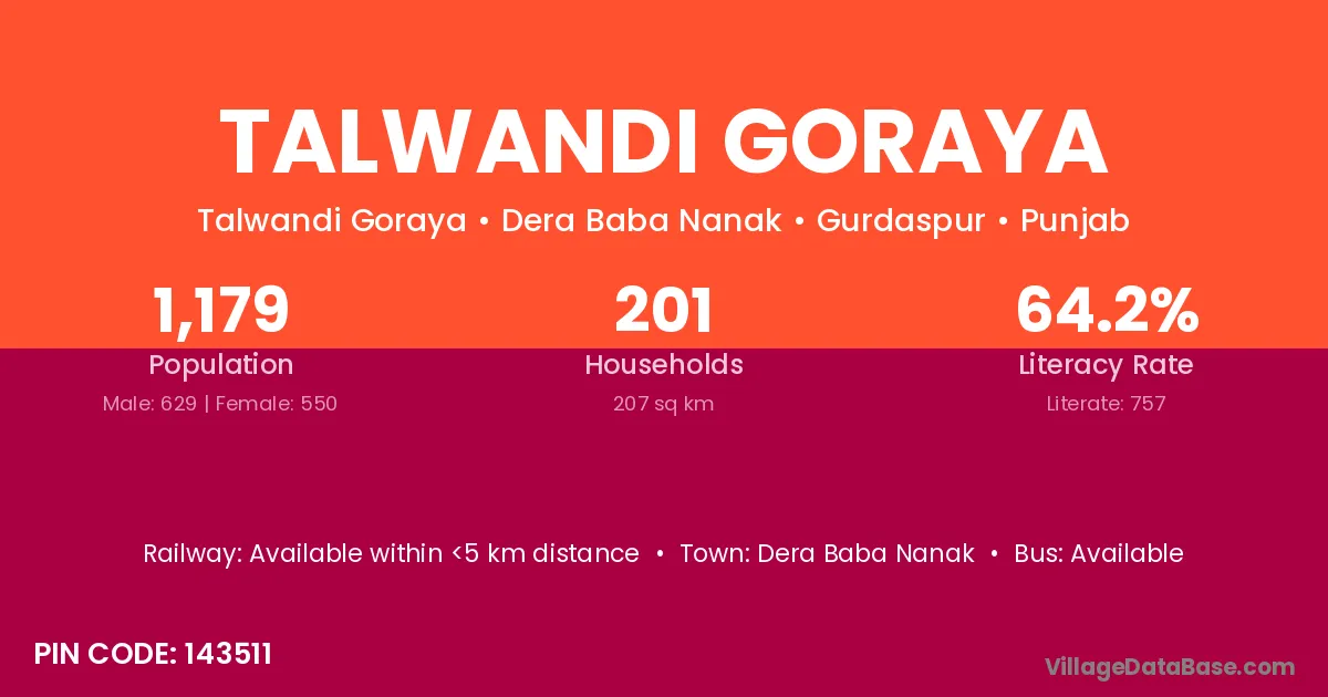 Talwandi Goraya village has a total population of 1,179 people, of which 629 are males and 550 are females.