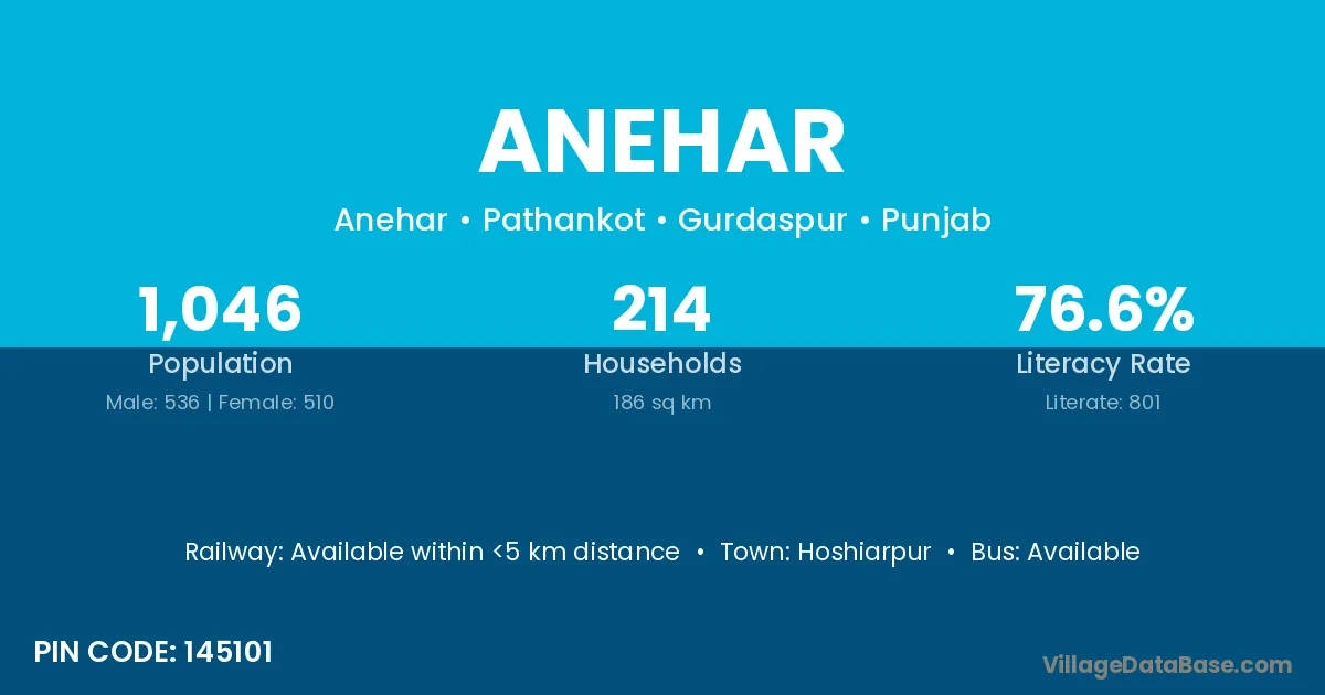 Anehar village has a total population of 1,046 people, of which 536 are males and 510 are females.