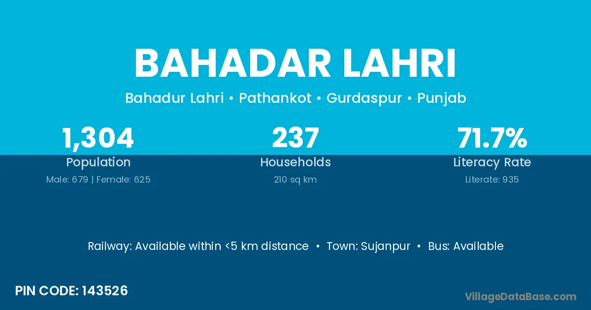 Sujanpur is the nearest town to Bahadar Lahri village for major economic activities