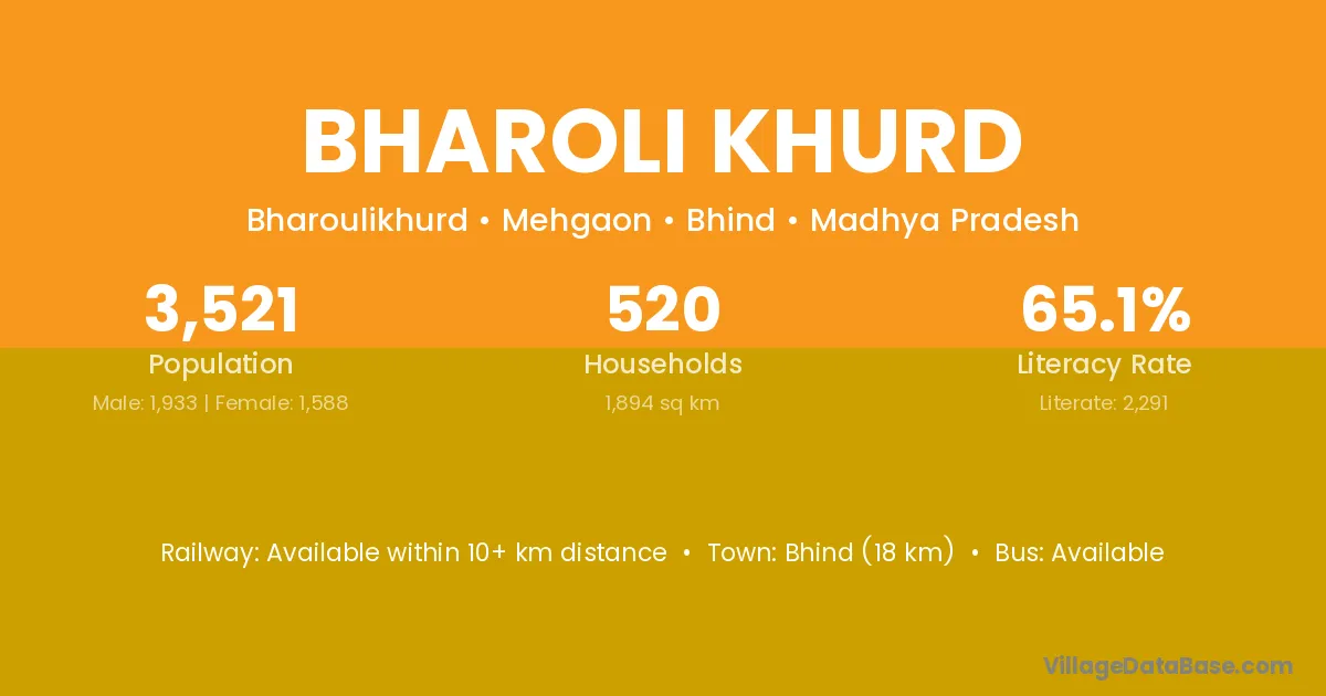 The literacy rate of Bharoli Khurd village is 73.07%. Male literacy stands at 77.05% and female literacy at 68.72%.