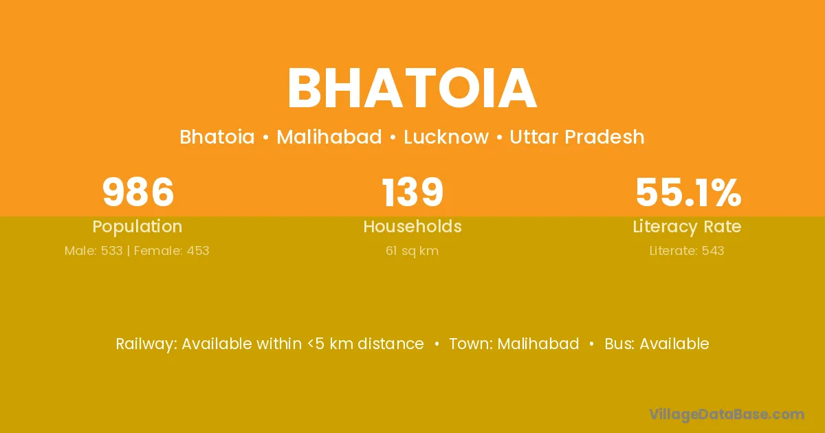 The literacy rate of Bhatoia village is 77.25%. Male literacy stands at 80.25% and female literacy at 73.91%.
