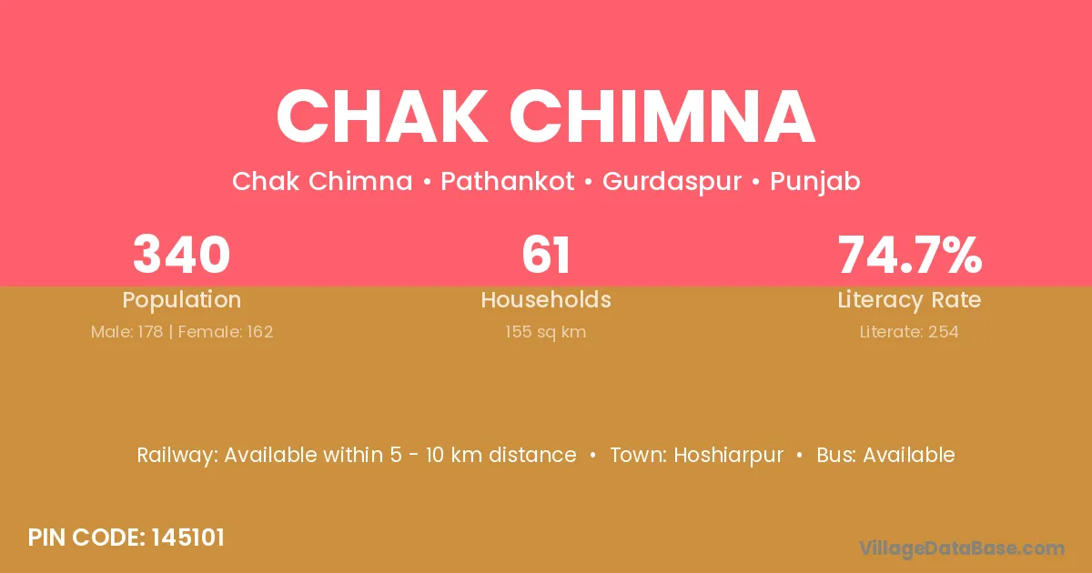 Hoshiarpur is the nearest town to Chak Chimna village for major economic activities