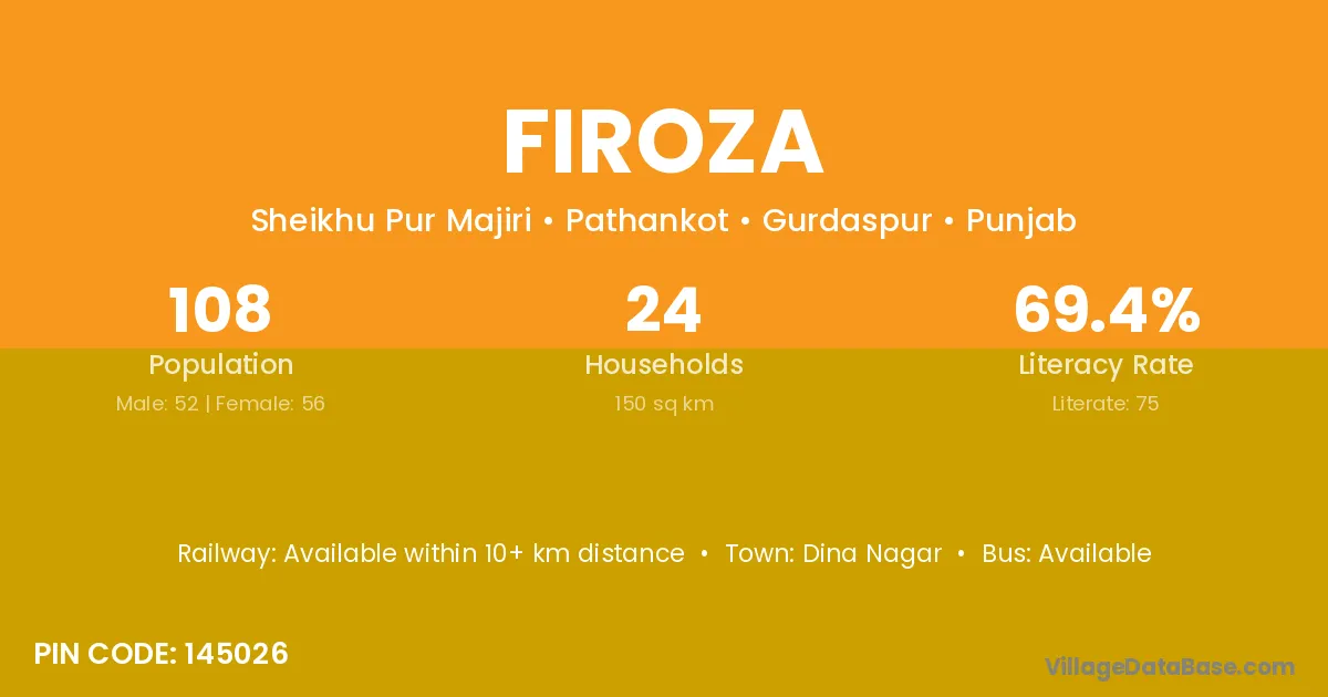 Firoza village has a total population of 108 people, of which 52 are males and 56 are females.