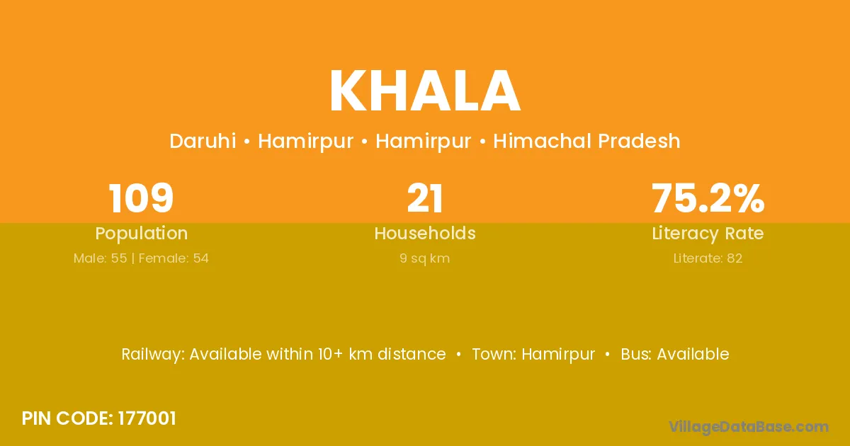 The literacy rate of Khala village is 73.87%. Male literacy stands at 86.27% and female literacy at 63.33%.