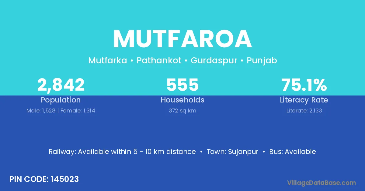 Mutfaroa village has a total population of 2,842 people, of which 1,528 are males and 1,314 are females.