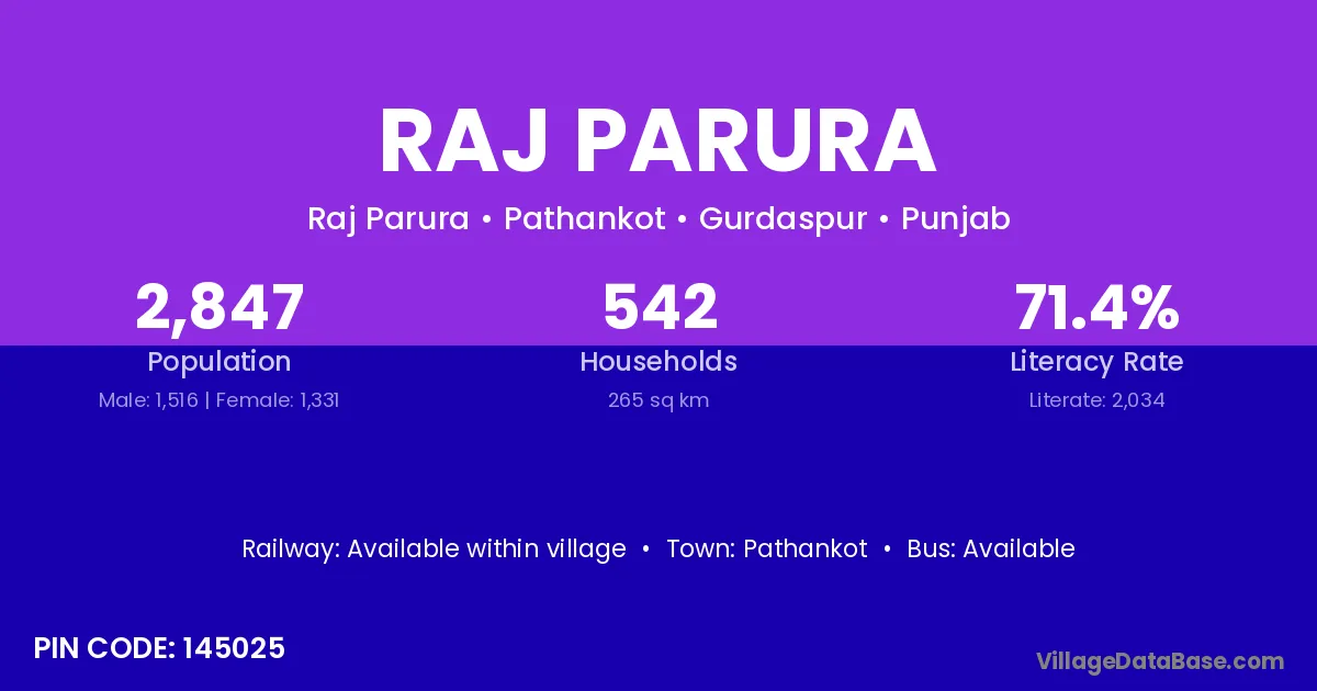 Pathankot is the nearest town to Raj Parura village for major economic activities