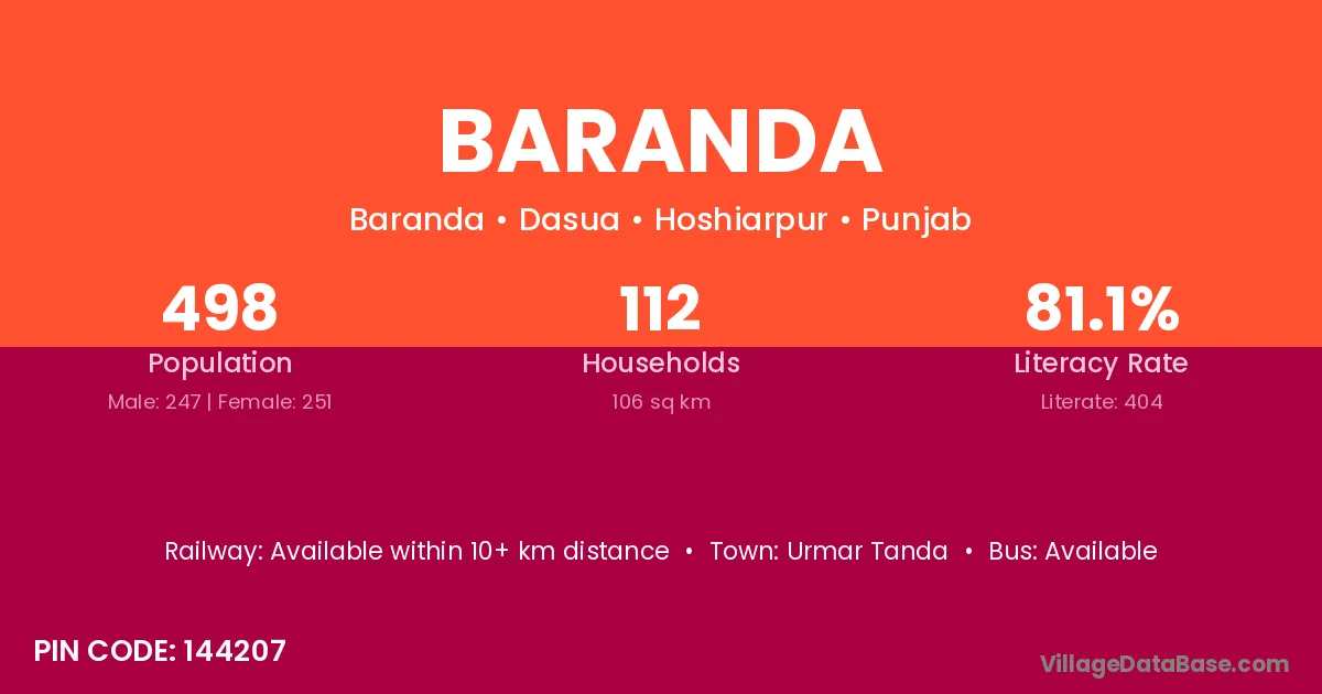 According to Census 2011 information, the village code of Baranda village is 144207.