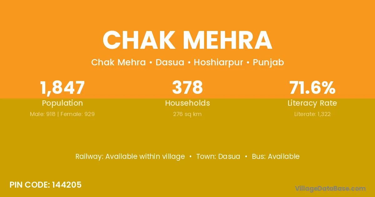 Chak Mehra village has a total population of 1,847 people, of which 918 are males and 929 are females.