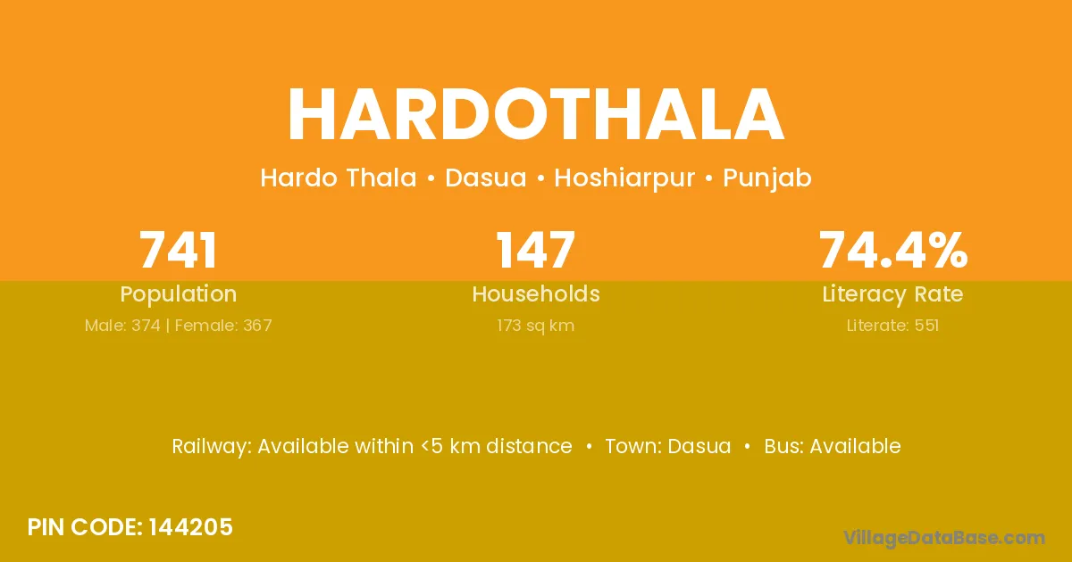 Hardothala village has a total population of 741 people, of which 374 are males and 367 are females.