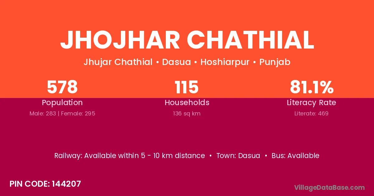 Jhojhar Chathial village has a total population of 578 people, of which 283 are males and 295 are females.