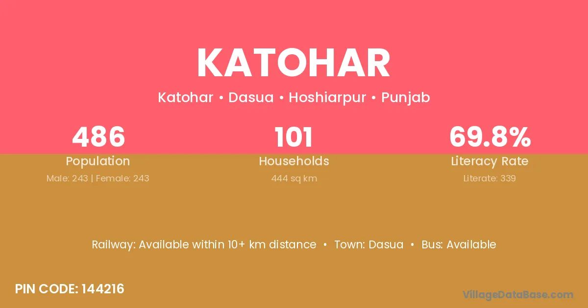 Katohar village has a total population of 486 people, of which 243 are males and 243 are females.