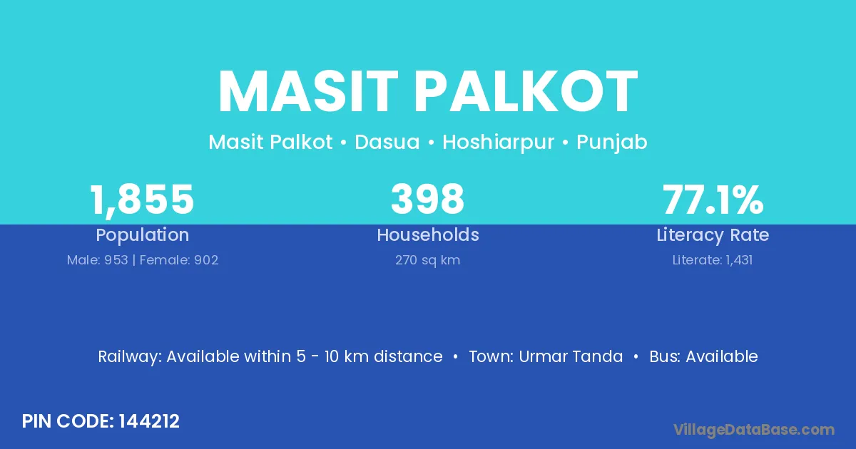 Masit Palkot village has a total population of 1,855 people, of which 953 are males and 902 are females.