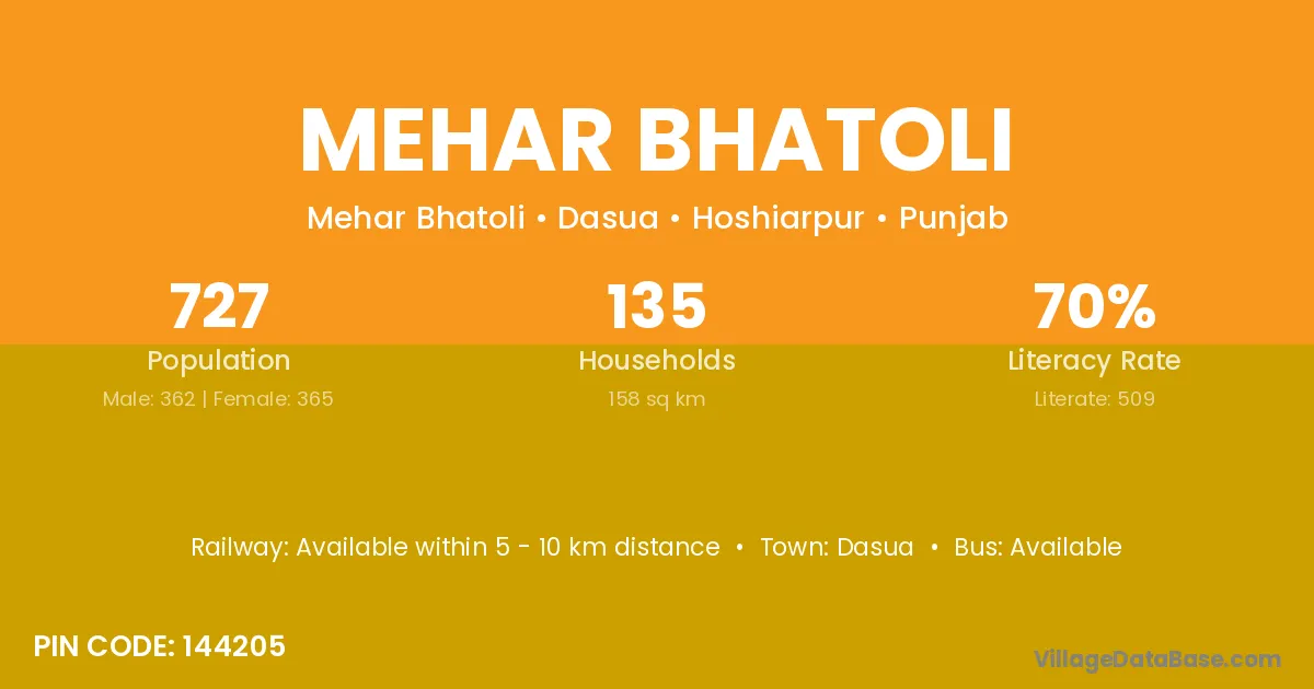 Dasua is the nearest town to Mehar Bhatoli village for major economic activities